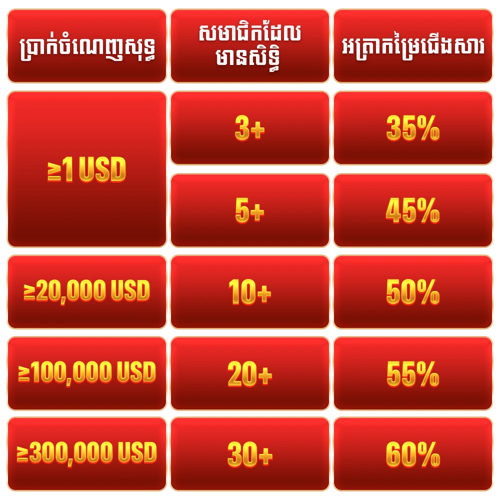 💠សមាជិកដែលមានសុពលភាព: សមាជិកត្រូវបានចាត់ទុកថាមានសុពលភាព ប្រសិនបើពួកគេមានការដាក់ប្រាក់យ៉ាងតិច $300 និងពិន្ទុភ្នាល់ 900ពិន្ទុ ឬច្រើនជាងនេះ (មិនរាប់បញ្ចូលសកម្មភាពប្រម៉ូសិន និង IP ស្ទួន)។